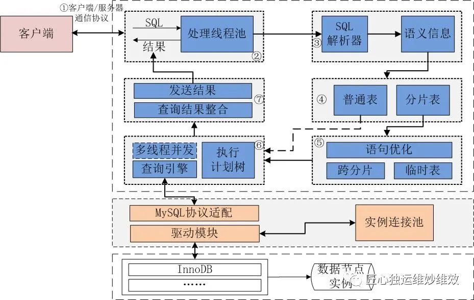 整合结果:数据节点接收到来自调度节点的请求,进行进一步的SQL解析,形成针对表的执行计划。查询计算完成后,数据节点将查询结果反馈至调度节点,由调度节点继续按执行计划树,对所有数据节点返回的分片结果进行归并、排序等操作,将完整的查询结果返回给客户端,完成查询请求。