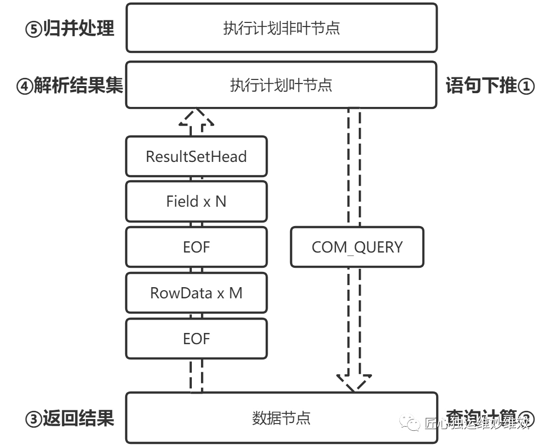 图4介绍了执行计划叶节点将查询请求下推至数据节点的通讯流程。COM_QUERY是封装了查询语句的协议包,由执行计划树叶节点发送至对应的数据节点进行查询计算。执行计划叶节点以MySQL协议流程接收、解析结果集。图示中结果集返回的协议包及次序为: