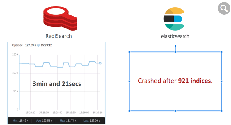 我们模拟了一个多租户电子商务应用程序,其中每个租户代表一个产品类别并维护自己的索引。源码库对于此基准测试,我们构建了 50K 个索引(或产品),每个索引最多存储 500 个文档(或项目),总共 2500 万个文档。RediSearch 仅用了 201 秒就构建了索引,平均每秒运行 125K 个索引。然而,Elasticsearch 在 921 个索引后崩溃了,显然它不是为应对这种负载而设计的。