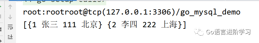 代码 复制//查询多条 sqlStr := "SELECT id,云服务器`name`,phone,address from userinfo where id >= ?" //参数同 QueryRow rows, err := db.Query(sqlStr, 1) if err != nil { fmt.Println("查询失败:", err) return } // 此处使用rows释放所有链接 defer rows.Close() //循环整理所有数据 var userList = make([]Userinfo, 0, 10) for rows.Next() { var user Userinfo err = rows.Scan(&user.Id, &user.Name, &user.Phone, &user.Address) if err != nil { fmt.Println("绑定数据失败", err) return } userList = append(userList, user) } fmt.Println(userList)1.2.3.4.5.6.7.8.9.10.11.12.13.14.15.16.17.18.19.20.21.22. 执行结果