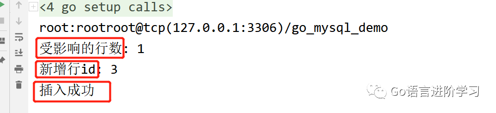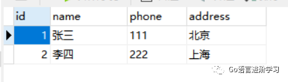 代码 复制//插入数据 sqlStr := "INSERT into userinfo(name,phone,address) values(?,?,?);" result, err := db.Exec(sqlStr, "吴彦祖", 555, "不知道哪的") if err != nil { fmt.Println("插入失败", err) return } //受影响的行数 row_affect, err := result.RowsAffected() if err != nil { fmt.Println("受影响行数获取失败:", err) return } fmt.Println("受影响的行数:", row_affect) lastId, err := result.LastInsertId() if err != nil { fmt.Println("新增行id获取失败:", err) return } fmt.Println("新增行id:", lastId) fmt.Println("插入成功")1.2.3.4.5.6.7.8.9.10.11.12.13.14.15.16.17.18.19.20.21. 执行结果