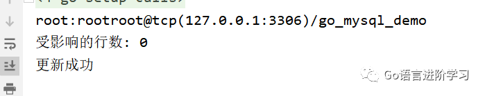 代码 复制//更新数据 sqlStr := `UPDATE userinfo set name=? where id=?;` result, err := db.Exec(sqlStr, "吴彦祖666", 3) if err != nil { fmt.Println("更新失败", err) return } //受影响的行数 row_affect, err := result.RowsAffected() if err != nil { fmt.Println("受影响行数获取失败:", err) return } fmt.Println("受影响的行数:", row_affect) fmt.Println("更新成功")1.2.3.4.5.6.7.8.9.10.11.12.13.14.15. 执行结果