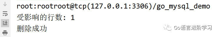 代码 复制//删除数据 sqlStr := "delete from userinfo where id = ?;" result, err := db.Exec(sqlStr, 3) if err != nil { fmt.Println("删除失败", err) return } //受影响的行数 row_affect, err := result.RowsAffected() if err != nil { fmt.Println("受影响行数获取失败:", err) return } fmt.Println("受影响的行数:", row_affect) fmt.Println("删除成功")1.2.3.4.5.6.7.8.9.10.11.12.13.14.15. 执行结果