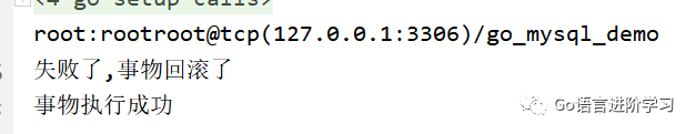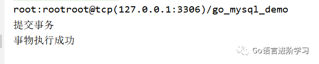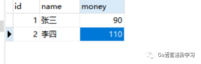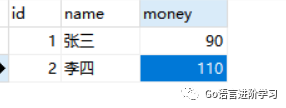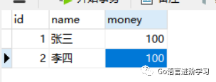 复制func main() { //事物 //开启事物 tx, err := db.Begin() if err != nil { //释放事物 if tx != nil { tx.Rollback() } fmt.Println("事物开启失败") return } 张三减10块Sql := `UPDATE bill set mnotallow=money - 10 where name = ?;` result, err := tx.Exec(张三减10块Sql, "张三") if err != nil { //有错误表示更是失败,回滚原来状态 tx.Rollback() fmt.Println(err) return } 张三受影响行数, err := result.RowsAffected() if err != nil { tx.Rollback() // 回滚 return } 李四加10块Sql := `UPDATE bill set mnotallow=money + 10 where name = ?;` result, err = tx.Exec(李四加10块Sql, "李四") if err != nil { //有错误表示更是失败,回滚原来状态 tx.Rollback() fmt.Println(err) return } 李四受影响行数, err := result.RowsAffected() if err != nil { tx.Rollback() // 回滚 return } //都等于1表示成功,可以提交事务,修改数据 if 张三受影响行数==1 && 李四受影响行数==1{ //提交事务 fmt.Println("提交事务") tx.Commit() }else{ //有一个!=1表示没有更新成功,可能用户不存在 fmt.Println("失败了,事物回滚了") tx.Rollback() } fmt.Println("事物执行成功") }1.2.3.4.5.6.7.8.9.10.11.12.13.14.15.16.17.18.19.20.21.22.23.24.25.26.27.28.29.30.31.32.33.34.35.36.37.38.39.40.41.42.43.44.45.46.47.48.49.50.51.52.53.54. 执行结果