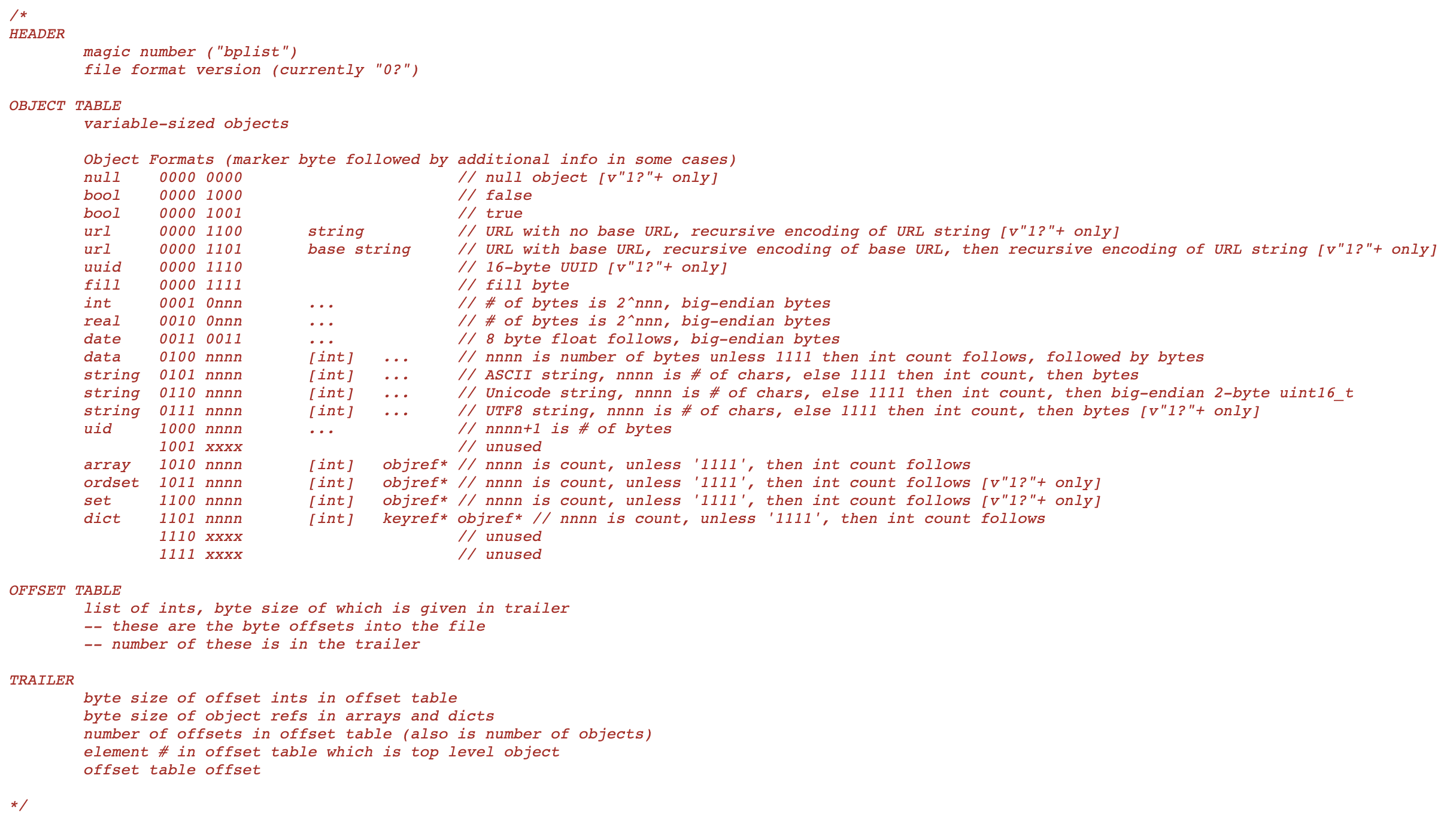 通过查看苹果的开源代码,可以更好地理解bplist格式,我也发现这个参考非常有用。苹果开源代码中定义的bplist格式如下: