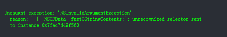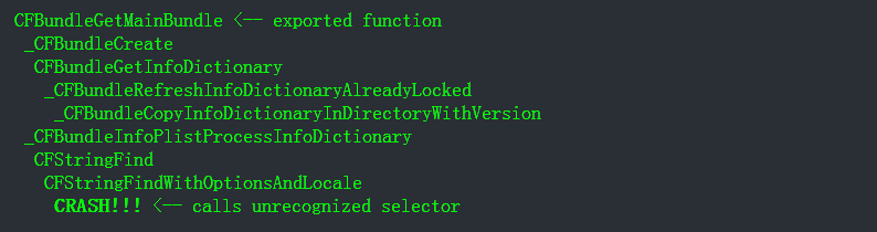 注意,在Objective-C异常处理之前,崩溃的位置不是来自CFStringFind,而是实际上调用_CFStringGetCStringPtrInternal的CFStringFindWithOptionsAndLocale,最终由于调用错误的选择器_fastCStringContents而崩溃。这样做的原因是,剩余的nscfdata类型实际上有一个长度选择器,所以它成功地通过了我们之前看到的第一个崩溃位置,并进一步进入Core Foundation,直到它调用另一个未识别的选择器。