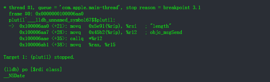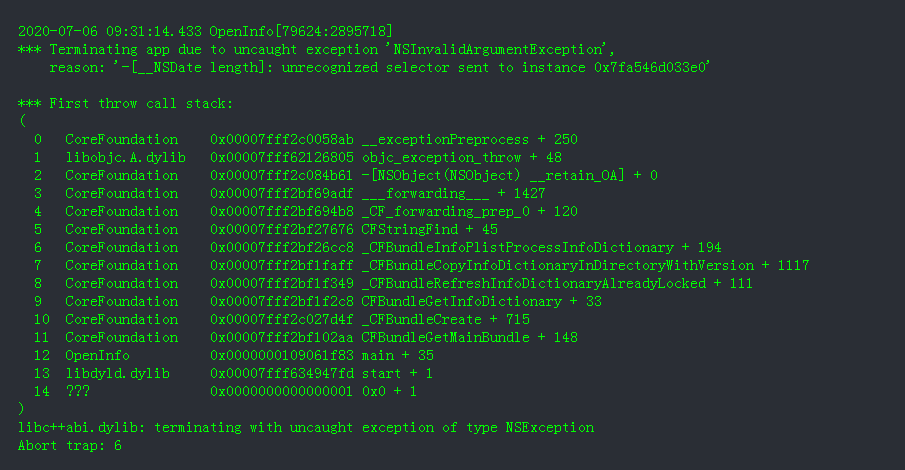 经过几次执行之后,很明显plutil实际上在其他位置崩溃,而不是在Core Foundation中崩溃。下面的输出说明了它试图在__NSDate类型上调用长度选择器,该类型会导致无法识别的选择器异常,但是此漏洞存在于plutil中,而不存在于Core Foundation中。