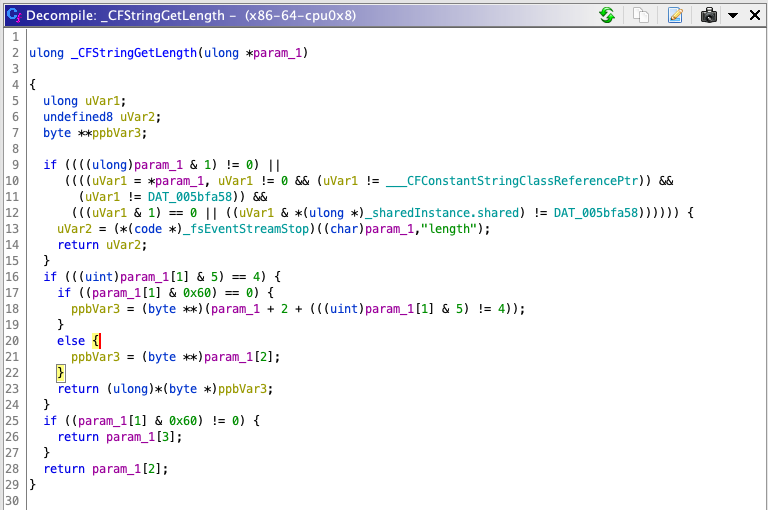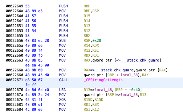 我逐步完成了LLDB中的CFStringFind,直到调用_CFStringGetLength来检查寄存器之前。从苹果的_CFStringGetLength文档中,我们知道第一个参数应该是字符串,因此我们可以使用以下LLDB命令检查RDI寄存器。