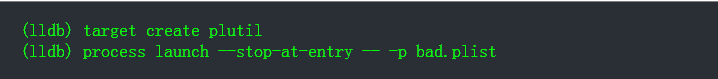在此研究的早期,我使用plutil从恶意bplist生成崩溃,然后编写了自己的代码以到达必要的代码路径。以下命令通过使用plutil作为目标进程和print plist标志来设置一个LLDB会话,以开始调试此崩溃,该标志只会打印出人类可读版本的属性列表。