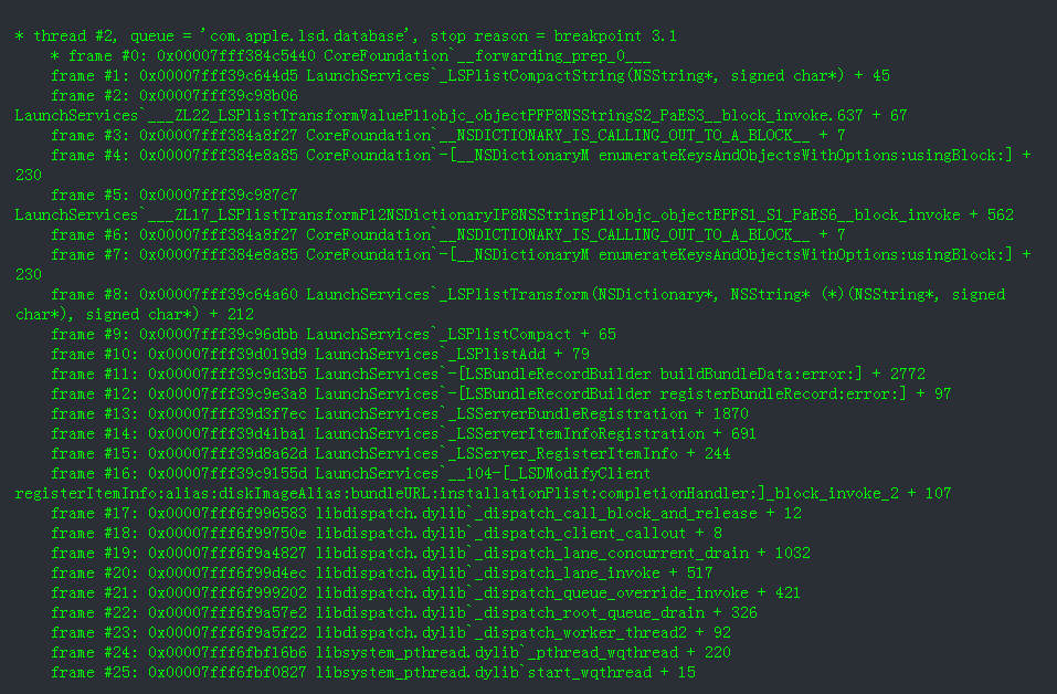 似乎在许多macOS应用程序中存在类似的漏洞,这些漏洞假定bplists仅包含字符串对象类型。 LSD进程崩溃的堆栈跟踪如下所示: