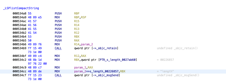 如果我们使用GHIDRA来反汇编_LSPlistCompactString函数,则可以看到偏移量45或0x2D导致我们又对漏洞对象类型进行了另一个长度调用,大概是从我们现在在LSD数据库中的恶意bplist调用的: