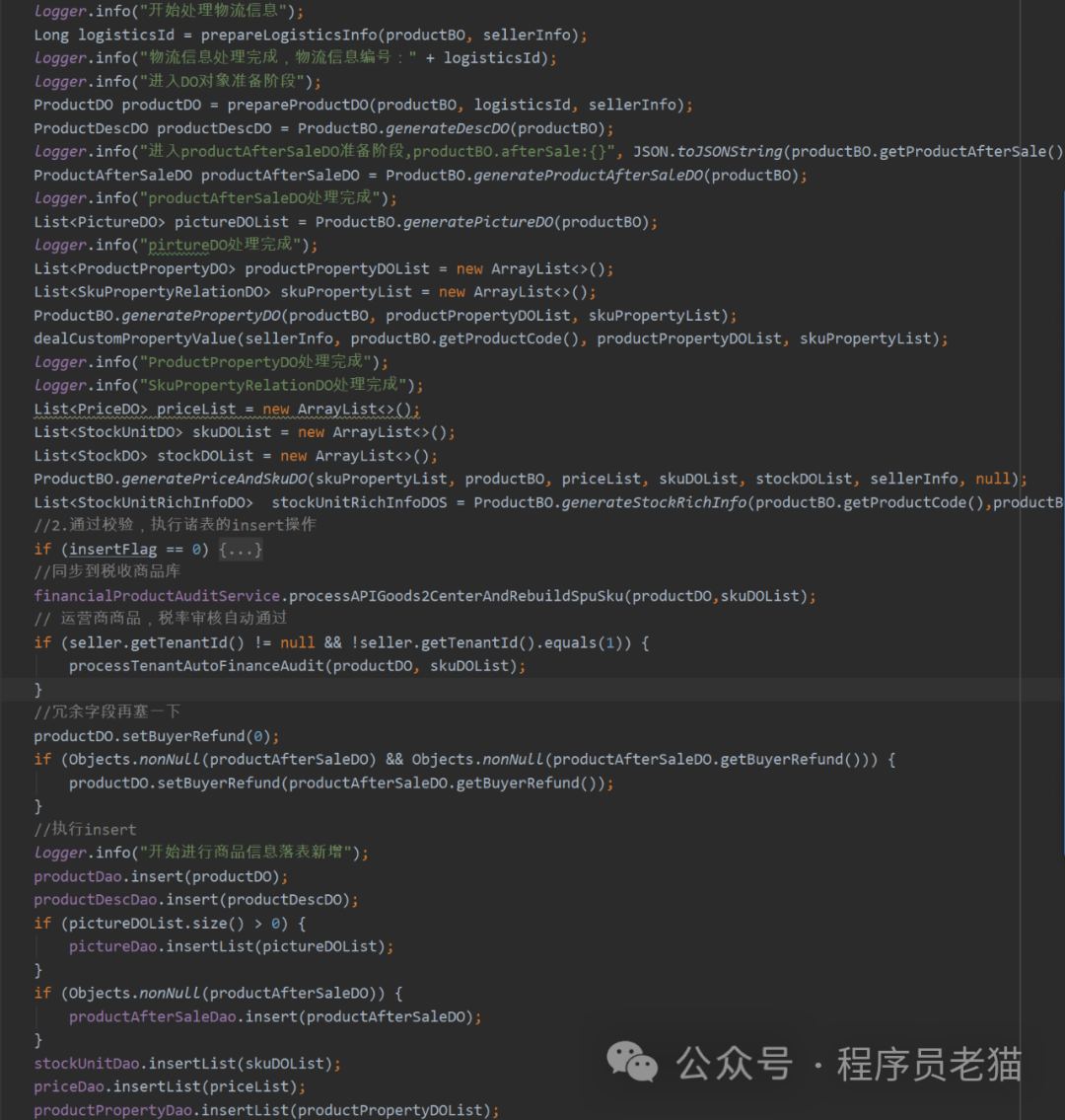 复制@Autowired private TransactionTemplate transactionTemplate; public boolean publishProduct(PublishProductRequest request) { externalSellerAuthorizeService.checkAuthorizeValid(request.getSellerId(),request.getThirdCategoryId(),request.getBrandId()); ...... transactionTemplate.execute((status) -> { try{ //执行insert productDao.insert(productDO); productDescDao.insert(productDescDO); .... //其他insert以及update操作 }catch (Exception e) { //回滚 status.setRollbackOnly(); return true; } return false; }); return true; }1.2.3.4.5.6.7.8.9.10.11.12.13.14.15.16.17.18.19.20.21.22.非update以及insert动作外移。