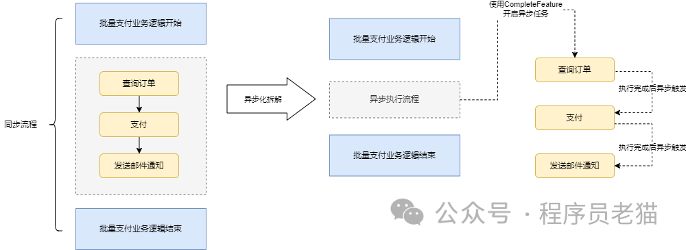 方案一,采用CompletableFuture异步编排特性,当业务流程比较长的时候,我们可以将一个大业务拆解成多个小的任务进行异步化执行。比如咱们有个批量支付的业务逻辑,因为整个流程是同步的,所以大概有了下面这样的流程。(关于CompletableFeature老猫觉得挺有意思的,后续老猫会出专门的文章来理透该特性,欢迎大家持续关注)。