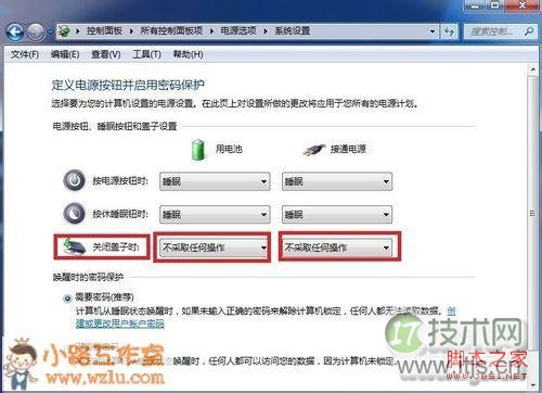 在弹出的页面中,源码库在“关闭盖子时”后面设置中,置图分别选择对“用电池”的统笔“不采取任何操作”以及“接通电源”的“不采取任何操作”