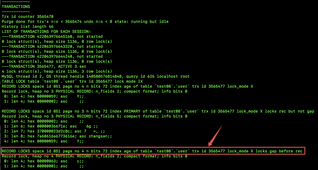红色框选中的,就是一个间隙锁的加锁记录,可以看到,在某一个记录之前加了间隙锁。