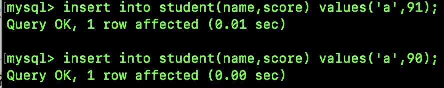 复制CREATE TABLE `student` ( `id` int(11) unsigned NOT NULL AUTO_INCREMENT, `name` varchar(255) COLLATE utf8mb4_unicode_ci DEFAULT NULL, `score` double NOT NULL, PRIMARY KEY (`id`), UNIQUE KEY `score` (`score`)) ENGINE=InnoDB AUTO_INCREMENT=4 DEFAULT CHARSET=utf8mb4 COLLATE=utf8mb4_unicode_ci;1.2.3.4.5.6.7.id 是主键,score 是成绩,其中 score 是唯一非空索引。