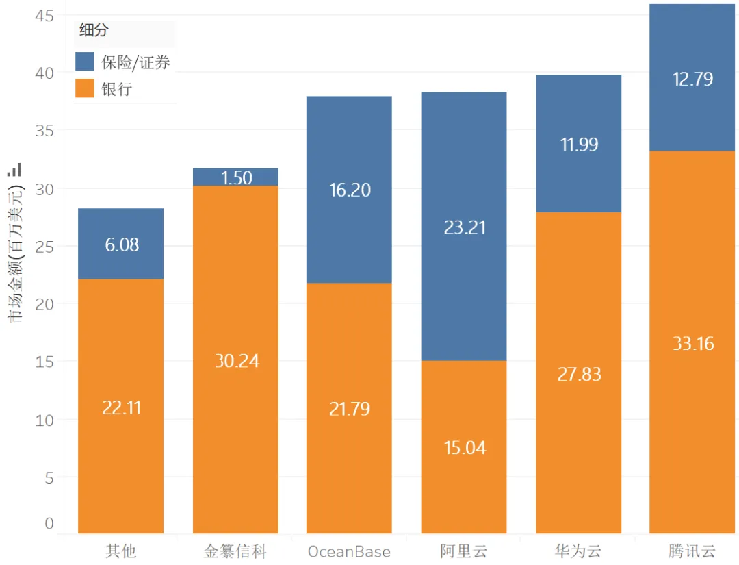 再从细分行业来看,银行与保险/证券,又有着明显的差异。从上文可见,银行的体量还是要大于保险/证券,但各家的发展重点还是存在差异。差异比较明显的是金纂信科和阿里云,前者绝大部分收入均来自银行,后者则大部分来自保险/证券;OceanBase等其他三家,则发展相对均衡。
