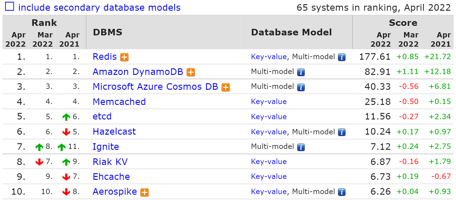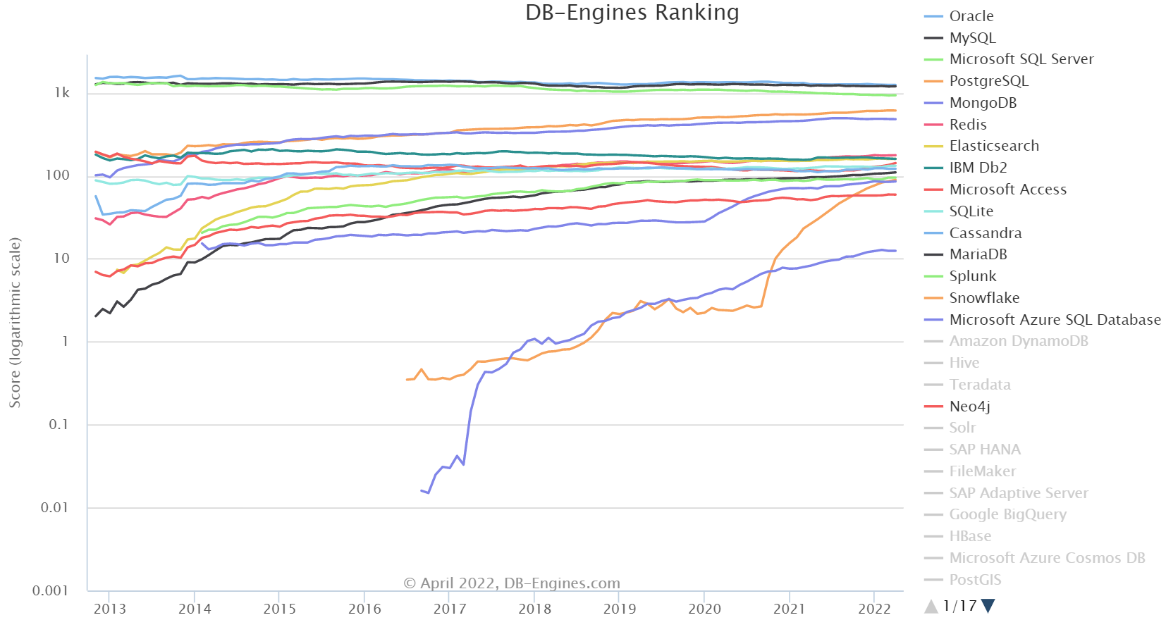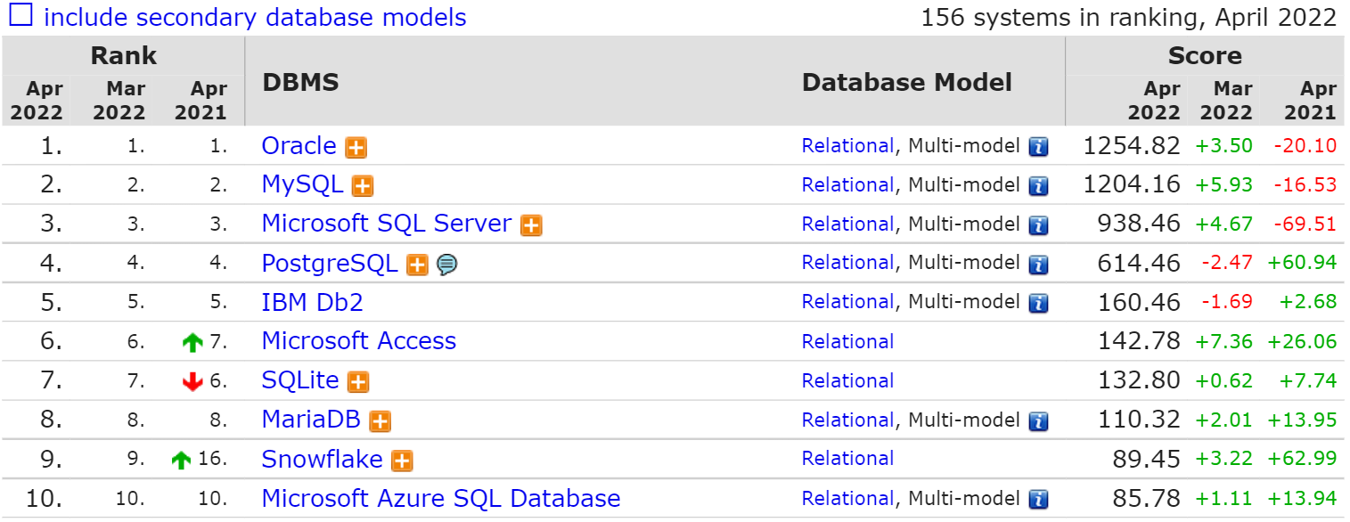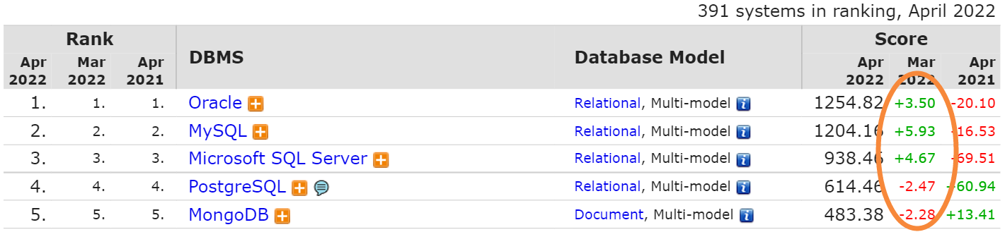 DB-Engines 数据库流行度排行榜发布了 4 月份的月数更新。