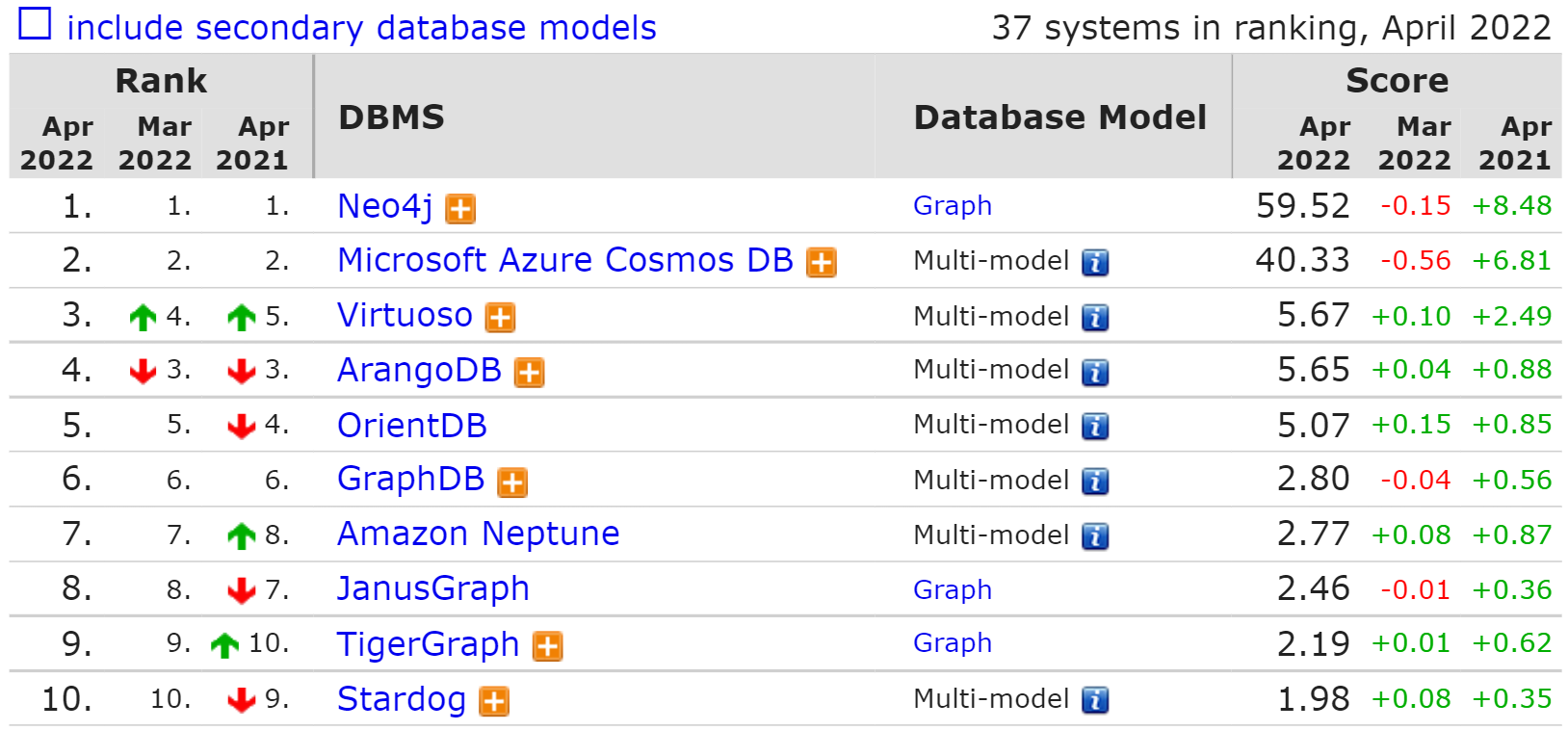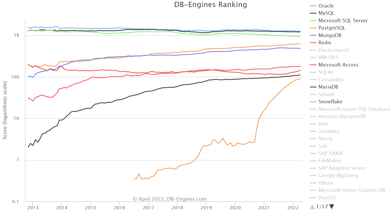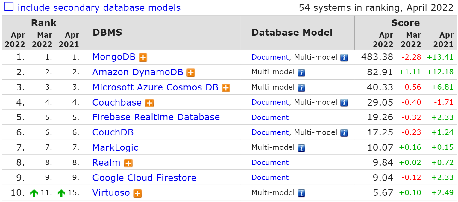 DB-Engines 数据库流行度排行榜发布了 4 月份的月数更新。