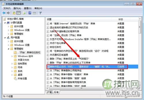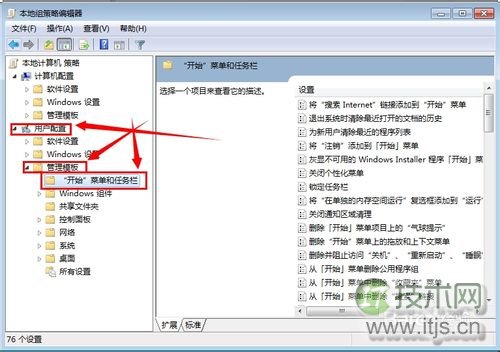 3、在弹出的有关组策略设置窗口中,依次点开 用户配置 - 管理模板 - 开始菜单和任务栏 如图