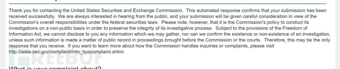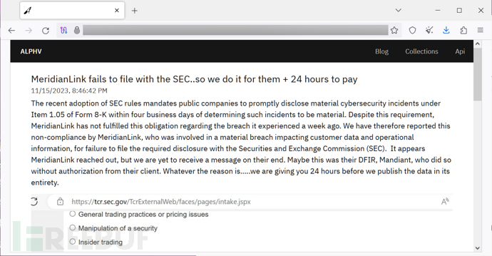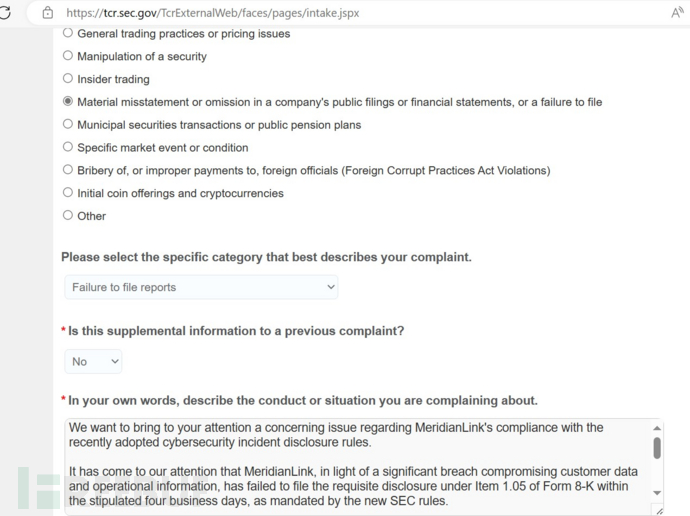 为了证明投诉真实性,ALPHV 在其网站上公布 SEC 的提示、投诉和转介页面上填写的表格截图,显示攻击者向 SEC “告密”,MeridianLink 在遭受了 "重大违规"安全事件后,并没有按照 8-K 表格 1.05 项的要求披露。