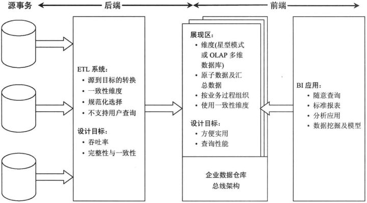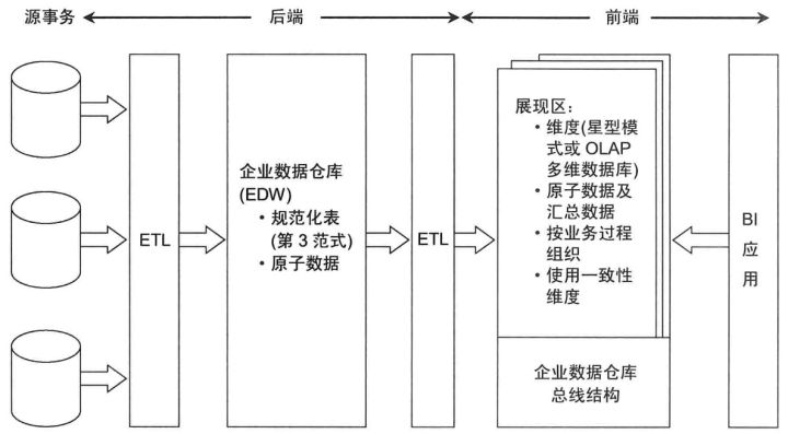从上面几张图上我们可以看到,之所以在Kimball的书中会有与Inmon组合的混合架构,是因为这几张架构图中的层次基本是一致的。而Kimball架构中并未去描述如何去做数据的规范化、完整性、一致性,只是要去做,而Inmon的架构中恰好可以实现这个部分。对于后面数据展现区的数据模型,又都一致的认为是以维度模型来建模。