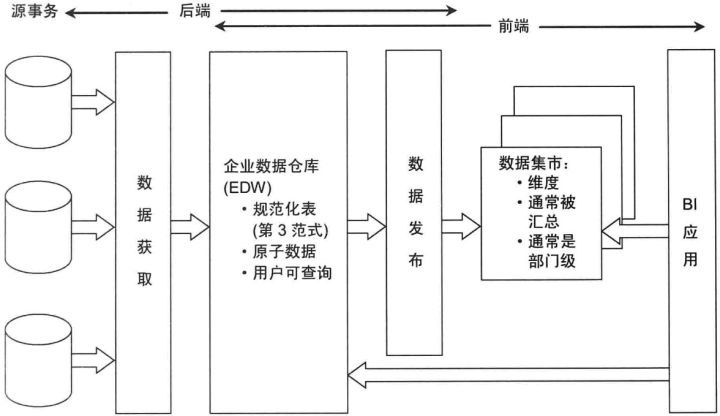 Bill Inmon - 全局视角,要先构建企业级数据仓库,然后再基于企业级数据仓库之上去构建数据集市。数据的整合是的企业对数据有一个真正企业范围级的观察,业务分析人员是从整体而不是局部进行数据分析。