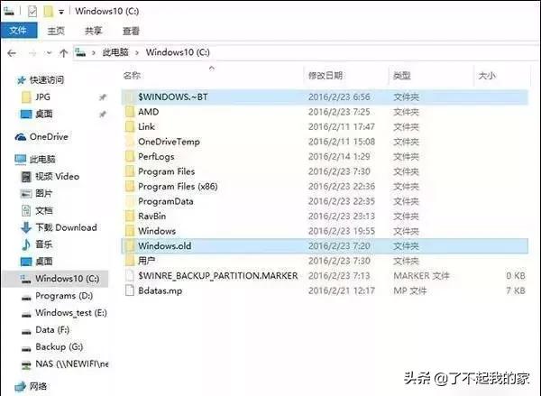 原来微软为了保存之前系统中的用户文件和数据,会准备几个临时文件夹,其中重要的两个就是“$Windows.~BT”和“Windows.old”: