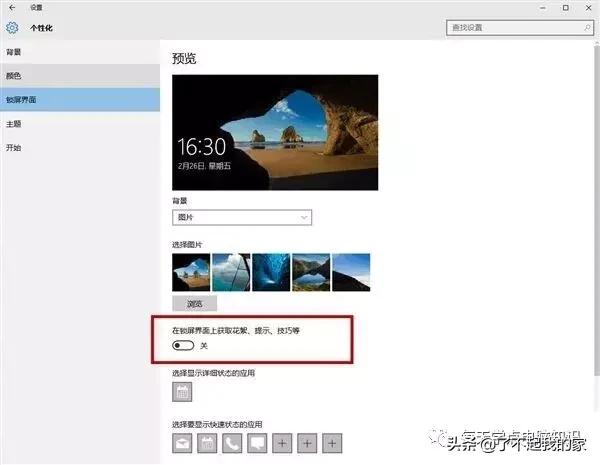 在这个界面下,你会发现设置面板中多出了一项“在锁屏界面上获取花絮、 提示、技巧等”开关,但事实上这里所谓是“技巧”几乎是看不到的,有的就是--各种广告。因此想让自己的眼睛清静一些,这个也是必关项之一。