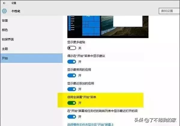 在【设置】-【个性化】-【开始】面板下,有一项【使用“全屏幕”开始菜单】的选项,勾选它之后,新版Win10开始菜单会立马变回Win8/8.1时代的全屏风格。嗯,你或许不喜欢,但总会有人喜欢吧?