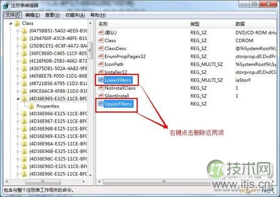 3.在注册表右边找到UpperFilters跟LowerFilters右键删除。拒绝决方如下图所示: