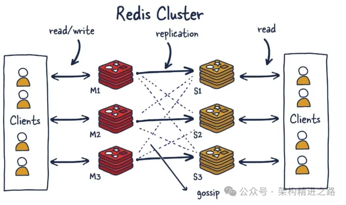 Redis Cluster 使用 gossiping 来确定整个集群的健康状况。在上图中,我们有 3 个 M 个节点和 3 个 S 节点。所有这些节点不断地进行通信以了解哪些分片可用并准备好为请求提供服务。