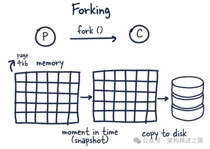 当你 fork 一个进程时,父进程和子进程共享内存,并且在该子进程中 Redis 开始快照(Redis)进程。这是通过一种称为写时复制的内存共享技术实现的——该技术在创建分叉时传递对内存的引用。如果在子进程持久化到磁盘时没有发生任何更改,则不会进行新的分配。