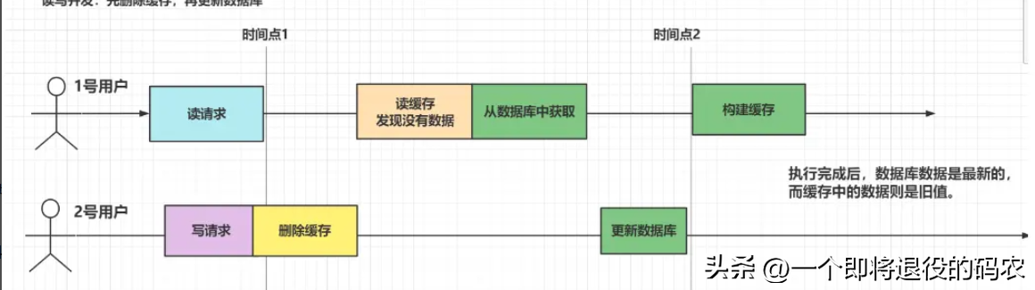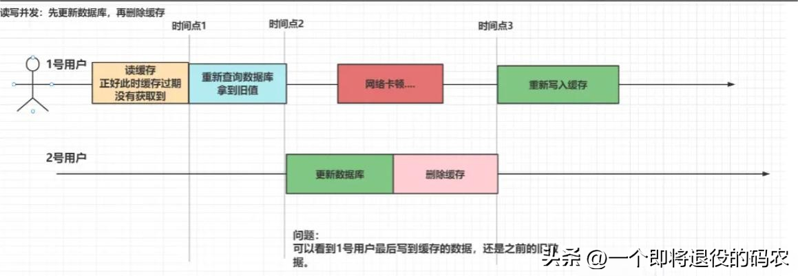 时刻1:读请求的时候,缓存正好过期时刻2:读请求在写请求更新数据库之前查询数据库,时刻3:写请求,在更新数据库之后,要在读请求成功写入缓存前,先执行删除缓存操作。这通常是很难做到的,因为在真正的并发开发中,更新数据库是需要加锁的,不然没一点安全性~