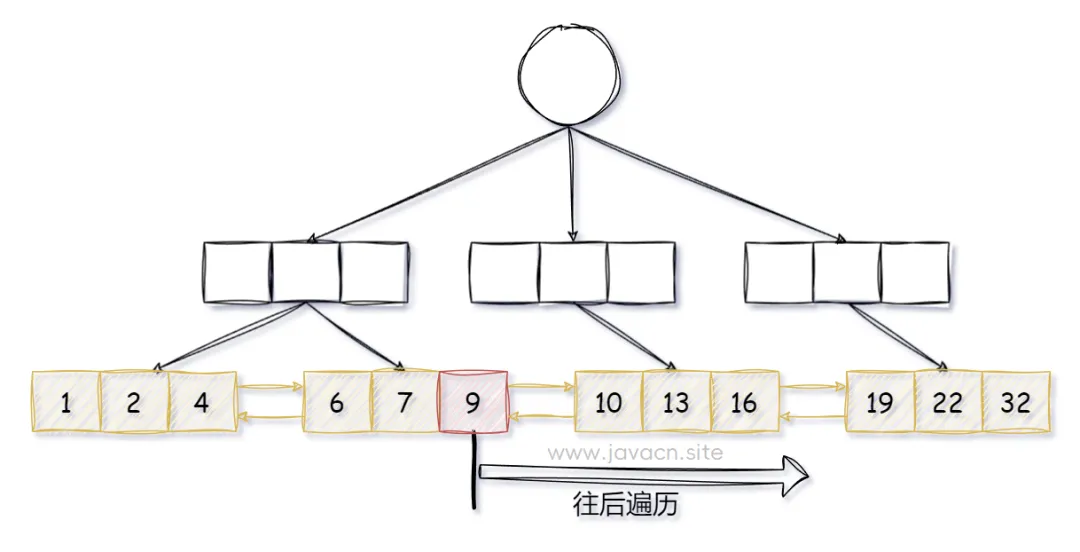 为什么起始ID查询效率高呢?因此这种查询是以上一次查询的最后 ID 作为起始 ID 进行查询的,而上次的 ID 已经定位到具体的位置了,所以只需要遍历 B+ 树叶子节点的双向链表(主键索引的底层数据结构)就可以查询到后面的数据了,所以查询效率就比较高,如下图所示: