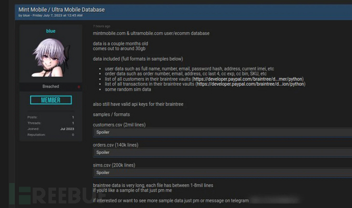 虽然该公司没有披露他们如何被入侵的细节,但 FalconFeeds 威胁情报服务在 2023 年 7 月报告说,有威胁行为者曾试图在一个黑客论坛上出售从Mint Mobile 和 Ultra Mobile 窃取的数据。