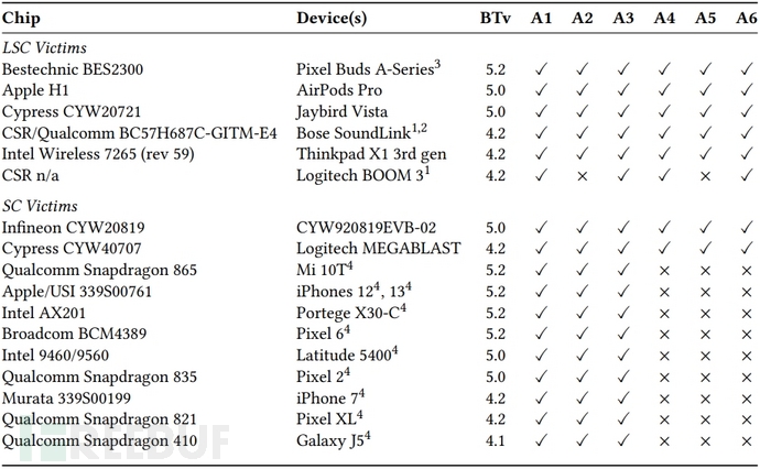 Eurecom的论文展示了针对多种设备(包括智能手机、耳机和笔记本电脑)进行的"BLUFFS"测试结果,这些设备上运行蓝牙系统是4.1至5.2版本。最终测试结果发现,包含六种攻击方式的"BLUFFS"攻击,至少有三种攻击方式产生了有效结果,这应该引起行业的重视。