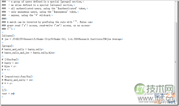 4 修改版本库的配置文件:svnserve.conf,去掉前面的搭建的方#,前面不能有空格
