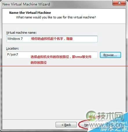 3. 这步里,给你的虚拟机起一个名字吧,可随意自拟;然后选择要安装文件的位置,注意,由于虚拟机镜像生成之后都比较大,所以选择的磁盘要有足够大的空间。然后可以点击next进入下一步: