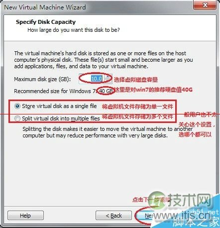 4. 选择虚拟机容量,相当于给你的虚拟电脑配一个一定容量的磁盘,根据你的虚拟机用途,自己选择。如图,我们安装Windows 7时,系统会建议不小于40G。之前我安装xp的虚拟机使用过4G,安装Windows 7的源码库虚拟机选择过10G都是可以成功,并且虚拟机可以正常使用的。建议也不要选的太小,过小程序会报空间不足。