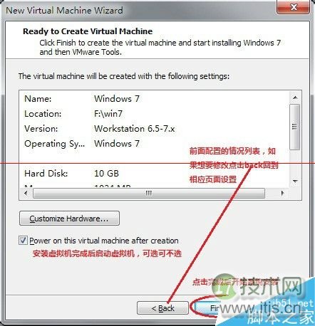 5. 这一步中,将我们配置的虚拟机的情况都列举出来,假如你觉得什么地方配置不合适了,可以点击back按钮退回重新配置。