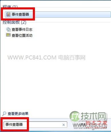 方法二:打开开始菜单,然后在搜素框中,搜素“事件查看器”即可,如下图所示,适合Windows 7系统。