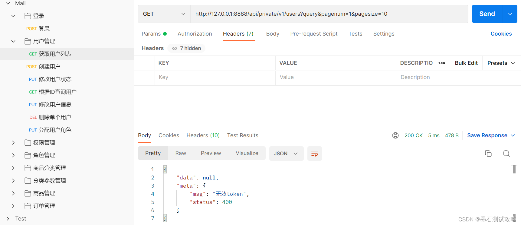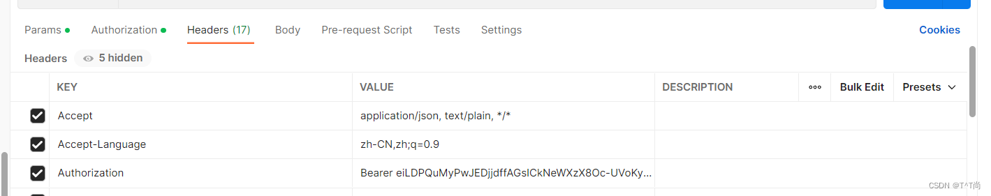 解决方法:可以在请求拦截器中给请求头添加token。调用将请求头Headers中key为Authorization的失效value值设置为token数据。