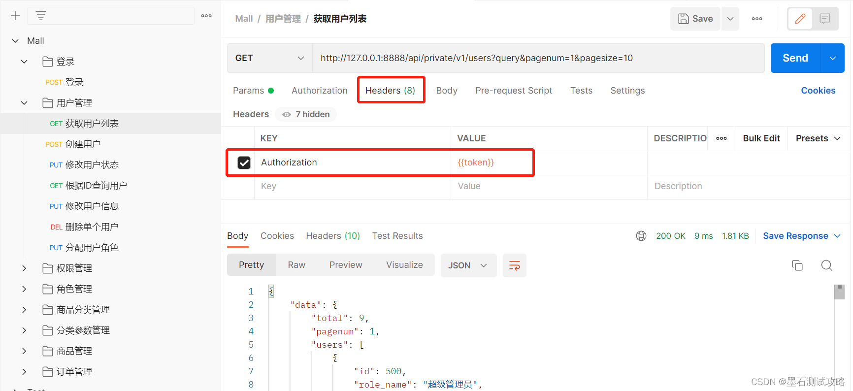 在需要引用token的接口请求Header中添加KEY:Authorization,值设置为环境变量`token`。