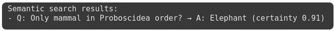 复制print(" Semantic search results:") for item in res["data"]["Get"]["Question"]: q, a, c = item["question"], item["answer"], item["_additional"]["certainty"] print(f"- Q: {q} → A: {a} (certainty {c:.2f})")1.2.3.4.输出: