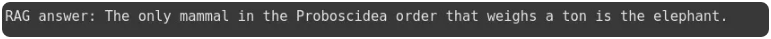 步骤8:检索-增强生成(RAG) 复制rag = ( client.query.get("Question", ["question", "answer"]) .with_near_text({"concepts": ["animal that weighs a ton"]}) .with_limit(1) .with_generate(single_result=True) .do() )1.2.3.4.5.6.7.语义搜索,并要求Weaviate使用OpenAI(通过generate)生成响应。