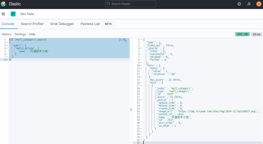 复制{ "took" : 1, "timed_out" : false, "_shards" : { "total" : 5, "successful" : 5, "skipped" : 0, "failed" : 0 }, "hits" : { "total" : { "value" : 1, "relation" : "eq" }, "max_score" : 21.59761, "hits" : [ { "_index" : "mall_category", "_type" : "mall_category", "_id" : "2537", "_score" : 21.59761, "_source" : { "update_time" : 0, "delete_time" : 0, "create_time" : 0, "image_url" : "https://img.tinywan.com/shop/img/2024-12/3a5cbd823.png", "parent_id" : 1361, "name" : "开源技术小栈", "id" : 2537, "sort_order" : 0, "is_show" : 1 } } ] } }1.2.3.4.5.6.7.8.9.10.11.12.13.14.15.16.17.18.19.20.21.22.23.24.25.26.27.28.29.30.31.32.33.34.35.36.