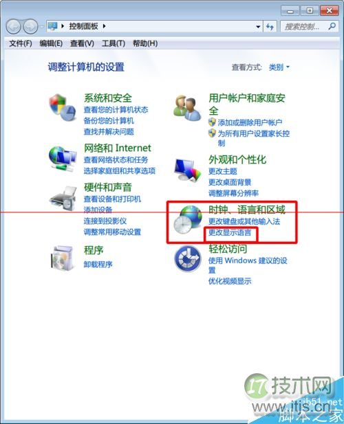 2、进入“Control Panel”(即中文里的“控制面板”),看,满屏的英文,头疼不头疼。选择【Clock, Language, and Region】下面的【Chage display language】,前面有个地球和时钟标记,language = 语言,这个单词认识吧? Change display language = 改变显示语言。