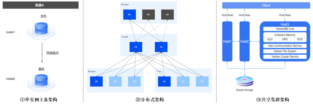 YashanDB在部署架构上分为单实例的主备部署、分布式部署以及共享集群的部署模式,部署架构如下图所示: