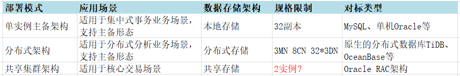 单实例主备架构:集中式数据库处理类型,基于高性能的服务器和存储满足高并发的联机类业务处理,同时1主多备的架构保证了系统的高可用。不过受限于单台服务器的处理性能和存储限制,适用于非大并发大数据量存储的应用。分布式架构:原生的企商汇分布式数据库架构,支持在线交易和实时数据分析混合交易,适用于海量数据分析以及数据仓库类应用共享集群架构:对标Oracle RAC的部署架构,满足核心业务场景的高性能、高可靠以及扩展性要求。适用于核心业务场景的国产化替换。